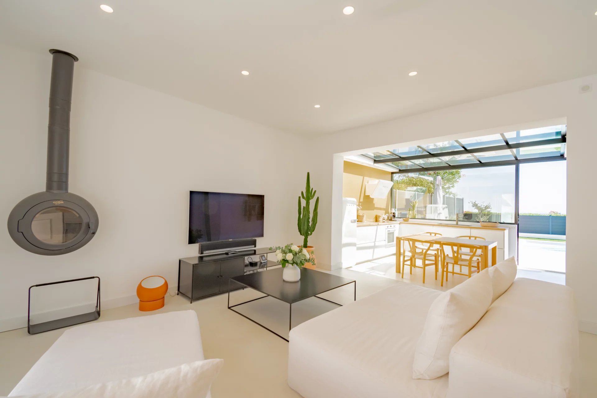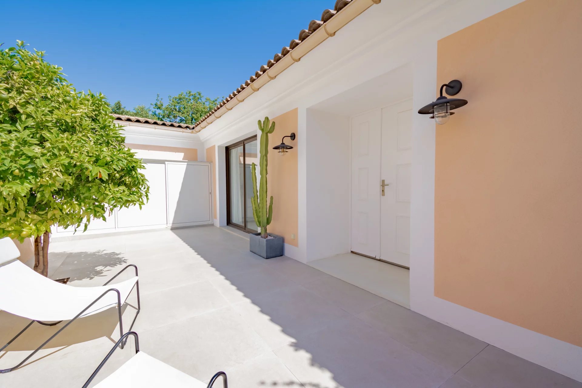 It comprises: a patio, an entrance hall, a bright, open-plan living room with kitchen and dining room opening onto the garden and pool, a master bedroom opening onto the garden with dressing room, a second bedroom with fitted wardrobes, a shower room and WC.